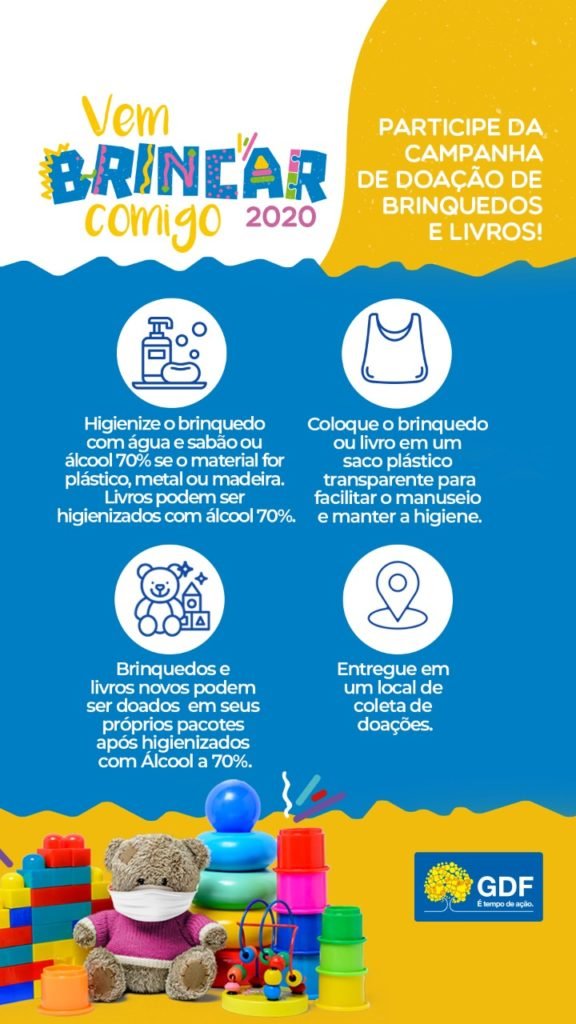 Entre 25 de agosto e 30 de setembro, será realizada a arrecadação dos materiais, que podem ser doados nas Administrações Regionais e nos batalhões da Polícia Militar e do Corpo de Bombeiros. As doações dos brinquedos e livros infantis arrecadados será feita pela Defesa Civil entre 5 e 12 de outubro, quando é comemorado o Dia das Crianças.